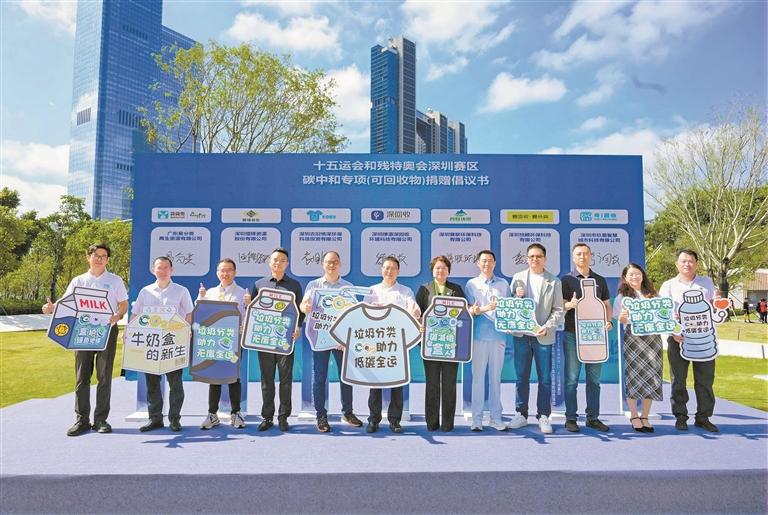 为将绿色成果直接赋能十五运会和残特奥会,活动特别设置碳减排量捐赠意向签约仪式。在深圳市生态环境局与深圳市城市管理和综合执法局的共同见证下,垃圾分类公益机构深圳市福田区零碳城市发展中心与十五运会和残特奥会深圳赛区执委会签订捐赠意向书,自愿捐赠奶盒回收行动中产生的碳减排量给赛事碳中和项目,让“企业践行责任、学生参与环保、共同助力‘无废全运’”的场景生动落地。