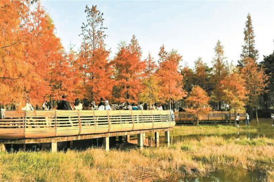 记者来到莲花山漾日湖旁的落羽杉树林时,已经有不少市民朋友驻足打卡。沿着蜿蜒的木制栈道向林间深处漫步,两侧红透的枝干舒展延伸,层层叠叠的羽叶交织成网,仿佛一步踏入浓墨重彩的油画秘境。抬头望,一簇簇红杉叶缀满天际,将蓝天晕染得温柔动人。