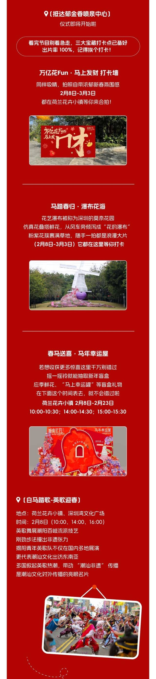荷兰花卉小镇将上演昆曲《牡丹亭》选段,梨园花韵婉转流淌;前海公园举办5场主题音乐互动;深圳湾文化广场呈现多场醒狮、英歌舞、摇摆舞等表演。