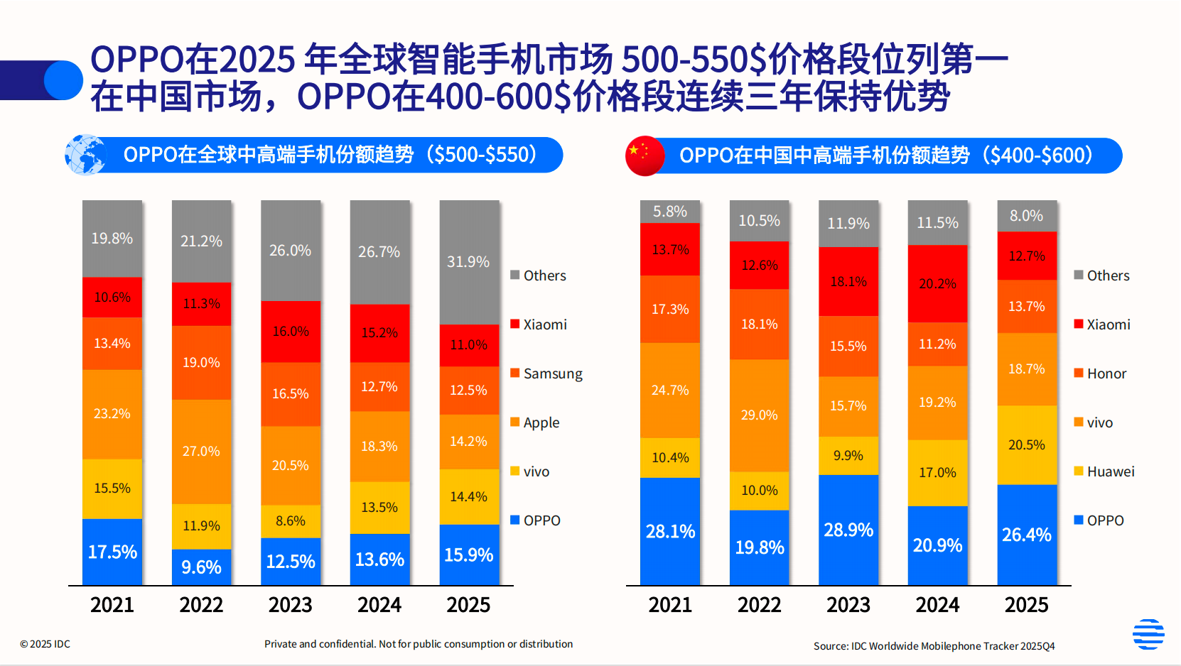 随着Ultra系列出海进程的持续加深,OPPO在全球市场的高端机型占比持续提升。根据权威市场调研机构IDC的数据显示,2025年,OPPO在全球500美元~550美元价位段稳居第一,并以284美元的平均售价位列全球第三,高端化成果日益显著。更重要的是,OPPO在海外市场正在完成品牌认知层面的质变,即从“性价比选择”向“高端可靠品牌”的认知跃迁,越来越多全球消费者将OPPO视为高端智能手机的可靠选项,而非性价比替代方案。