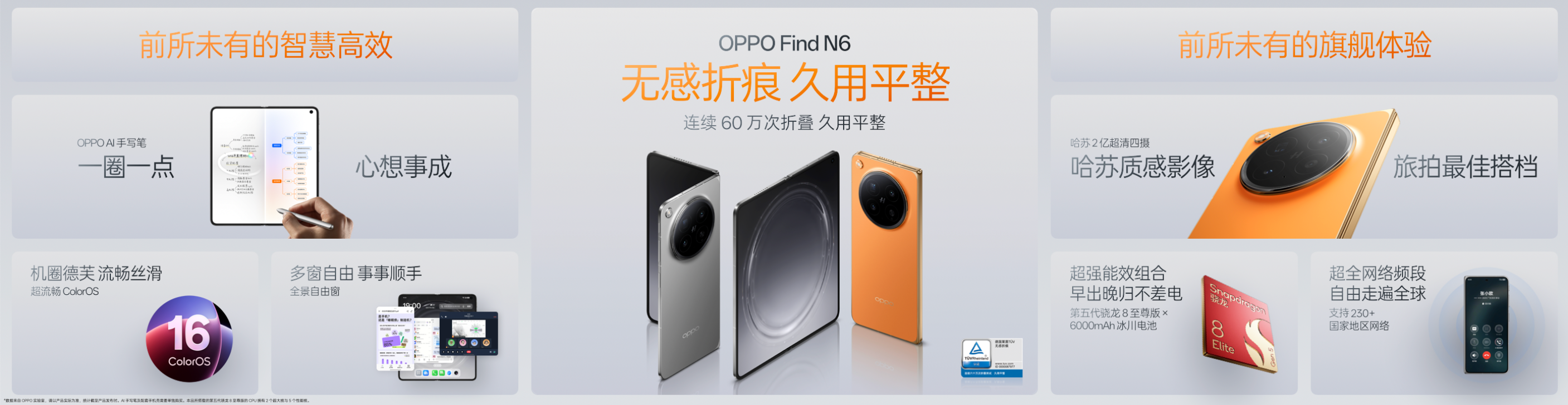 3月,OPPO发布全新折叠旗舰Find N6,以前所未见的平整度表现,打破了折叠屏平整度测试的历史纪录,被德国莱茵认证为“全球最平整的折叠手机”。这一极致体验背后,是OPPO在铰链工程、屏幕材料与折叠结构上多年积累的综合体现。折痕问题长期以来是折叠屏影响用户体验的最大痛点,Find N6通过“新一代钛合金天穹铰链”和“天穹记忆玻璃”等创新科技,成为全球首款通过德国莱茵TÜV无感折痕“连续60万次折叠测试久用平整”认证的折叠旗舰,引领折叠屏正式迈入“无感折痕,久用平整”的全新世代。