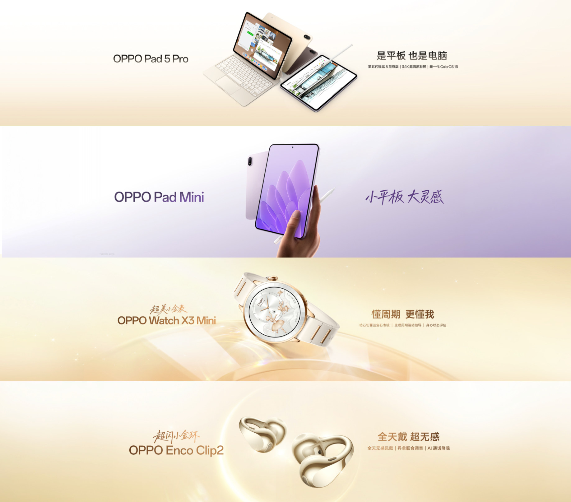 2026年,OPPO进一步加码IoT布局,产品矩阵继续扩容。旗舰级平板新品Pad 5 Pro延续OPPO在生产力与影音体验上的产品优势,为用户带来更完整、更专业的旗舰体验;全新Watch X3 mini作为行业首款专为女性生理周期减脂定制的智能手表,以精准的用户洞察切入细分健康场景,填补市场空白;新一代安卓旗舰智能手表Watch X3延续“安卓表皇”的产品基因,发布后在线下渠道实现同比120%的亮眼增长;全新耳夹式耳机Enco Clip2以开放式佩戴的舒适体验满足通勤出街的百搭需求,全天佩戴轻松无感;小尺寸平板Pad mini则进一步完善OPPO平板产品线在便携场景下的布局,覆盖轻度生产力与娱乐消费用户。值得一提的是,Pad 5 Pro和Pad mini两款旗舰平板均采用了由TCL华星提供的显示解决方案。
