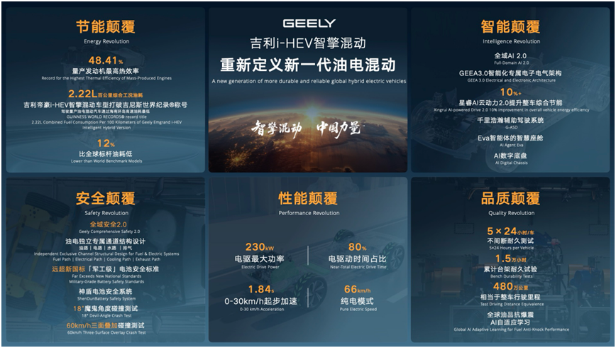 吉利i-HEV智擎混动技术成为展会焦点,以“五大代际优势”树立行业标杆:全域AI 2.0系统搭载GEEA 3.0电子电气架构与星睿AI云动力2.0大模型,发动机热效率达48.41%(全球量产第一),油耗较行业标杆低12%,帝豪i-HEV实测百公里油耗仅2.22L,刷新吉尼斯世界纪录。